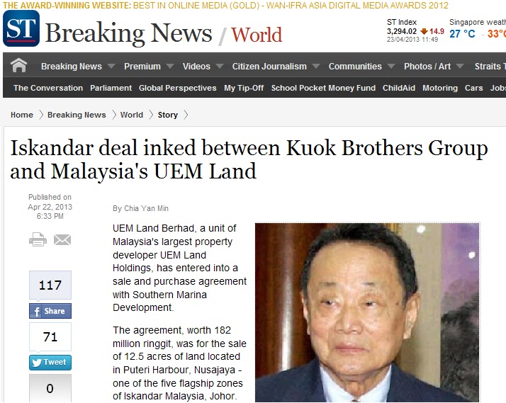 Akhbar Singapura dedahkan pemimpin UMNO jual tanah dengan harga rendah kepada Robert Kuok..