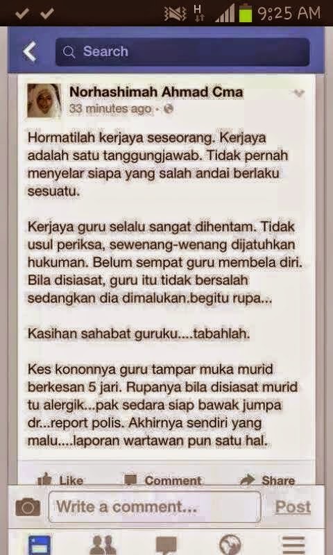 Semalam Harian Metro melaporkan bapa kepada seorang pelajar mendakwa anaknya ditampar oleh guru bahasa inggeris sehingga meninggalkan kesan di pipi kanan anaknya hanya kerana gagal menyiapkan kerja sekolah.